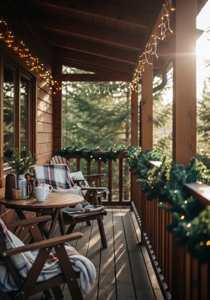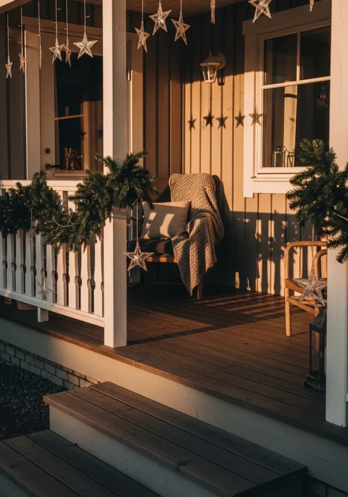 This sweet little porch sparkles with charm, featuring delicate star-shaped lights hanging from the ceiling and soft garlands along the railing. A cozy chair with a knitted throw waits in the corner, soaking up the late afternoon sun. The golden light casts long shadows, making the space feel peaceful and festive at the same time.