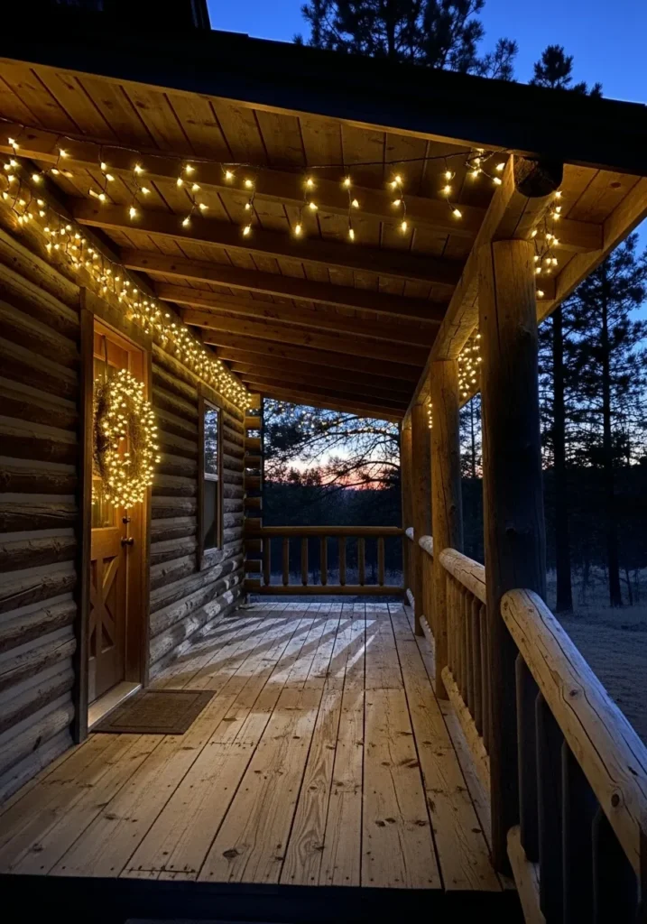 I absolutely love how this porch feels tucked away from the world. The lights are simple, but they create such a magical atmosphere against the rugged wood. It’s the kind of place that makes you dream of quiet snowy nights and good company.