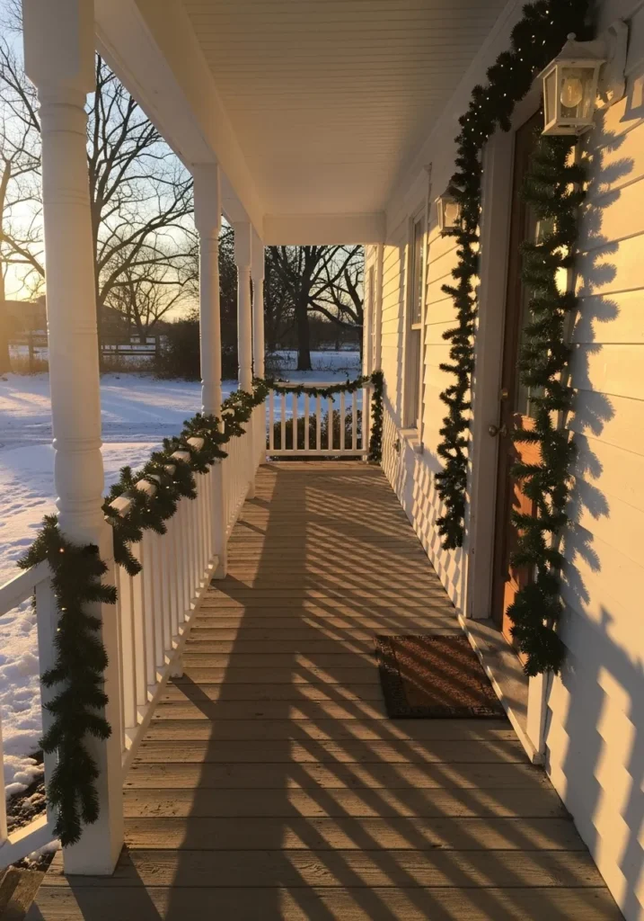 This country-style porch is bathed in the soft light of the setting sun, with classic green garlands wrapped around white railings and columns. The clean lines of the house let the greenery shine, adding just the right amount of holiday charm without feeling cluttered. The snow-dusted ground and long shadows make everything glow beautifully.