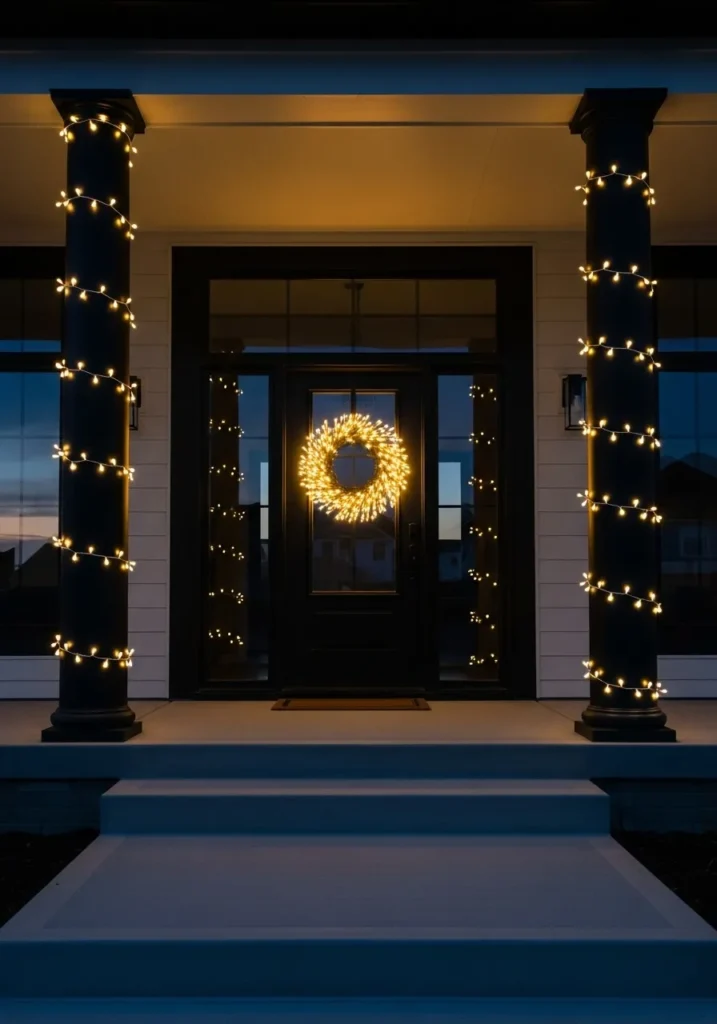 This porch makes elegance look effortless. The deep black columns are wrapped with golden string lights that twinkle like little stars, while the glowing wreath on the front door steals the show with its soft, radiant charm. It’s minimal, modern, and full of quiet sophistication.