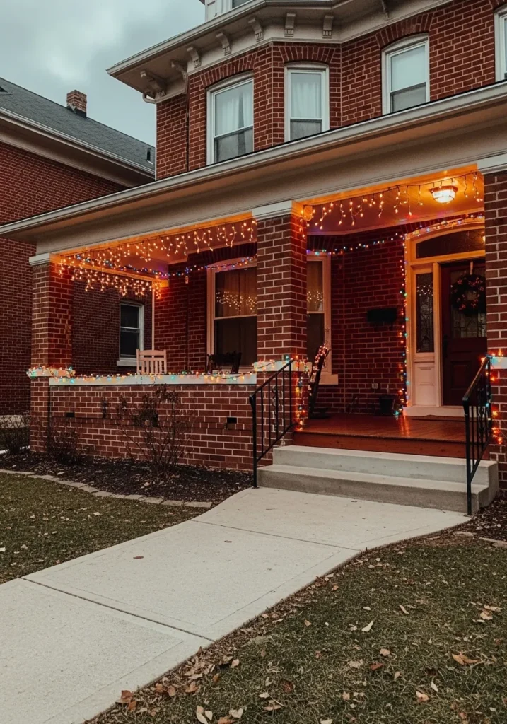 There’s something so charming about a red brick house dressed up for the holidays. The mix of icicle lights and multicolored bulbs instantly gives this porch that cheerful “old-fashioned Christmas” feel. It’s warm, welcoming, and full of personality—exactly how the holidays should feel.