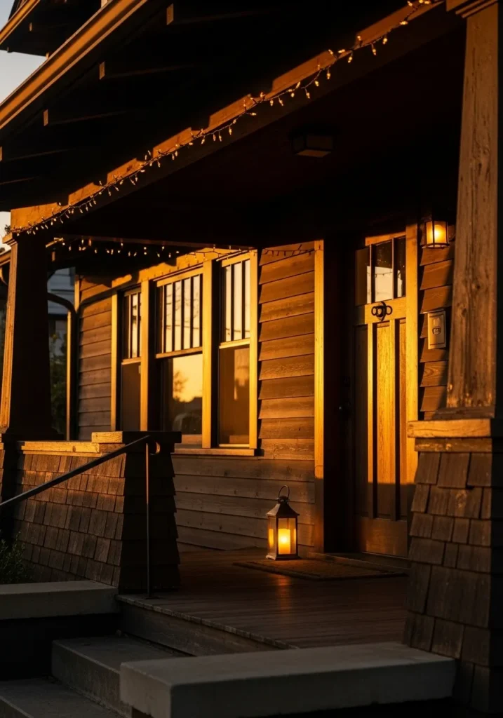 This rustic wooden porch glows beautifully in the soft evening light. Simple string lights line the roof, while a lantern near the door casts a golden flicker that adds instant warmth. The wood tones shine beautifully under the gentle glow, making the space feel calm and inviting.
