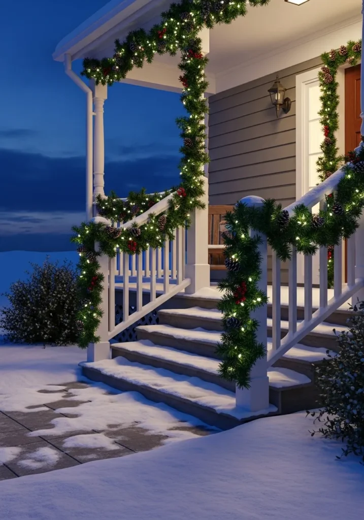 This snowy porch feels like a winter postcard come to life. Thick garlands trimmed with pinecones and red berries drape gracefully along the railings, glowing softly with warm white lights. The snow-covered steps and soft blue evening sky add to the magical, storybook feeling.
