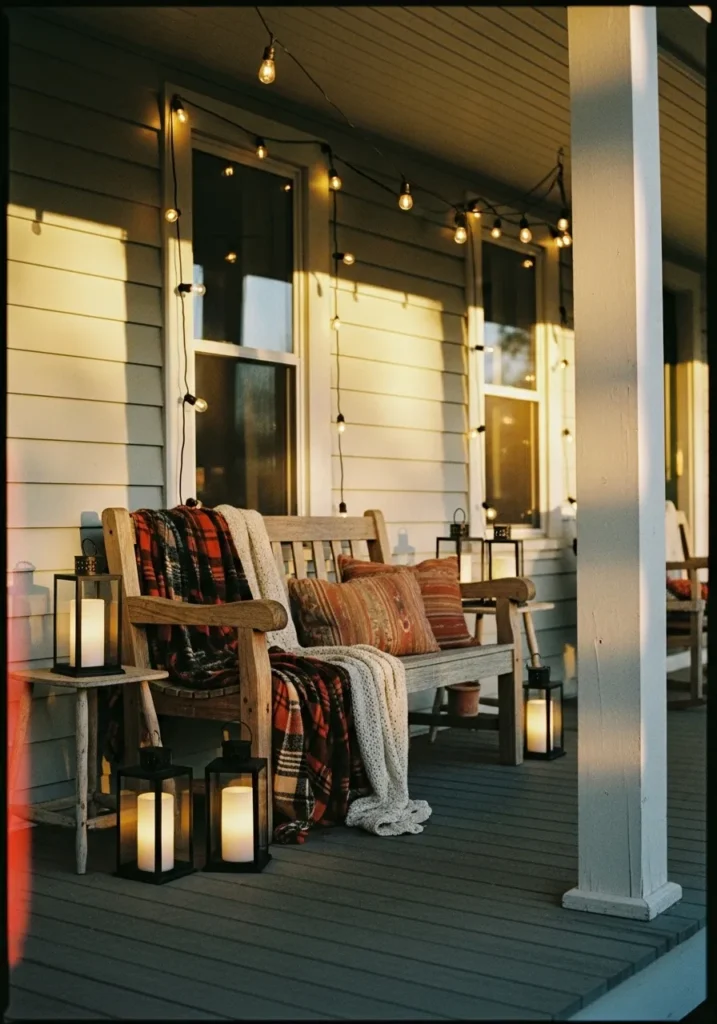 This front porch captures that golden, late-afternoon warmth that feels like a hug after a long day. A rustic wooden bench is dressed with soft plaid blankets and textured pillows, while candle-lit lanterns cast a gentle flicker across the floorboards. The soft string lights above complete the picture, wrapping the whole space in a cozy amber glow.