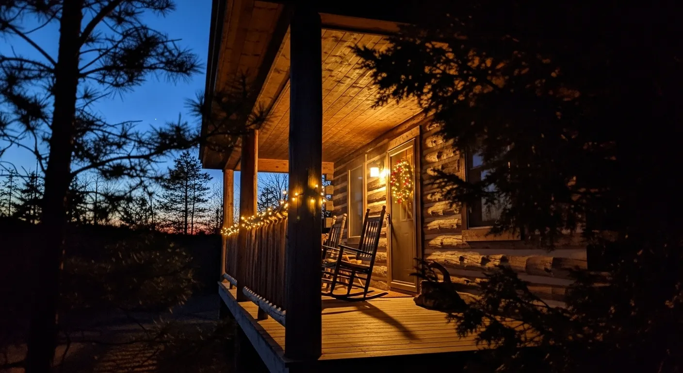 This log cabin porch glows like a cozy mountain retreat. The rich wood tones and rustic textures are highlighted by strings of warm fairy lights framing the roof and door. A glowing wreath adds the perfect finishing touch, catching the last light of sunset through the trees.