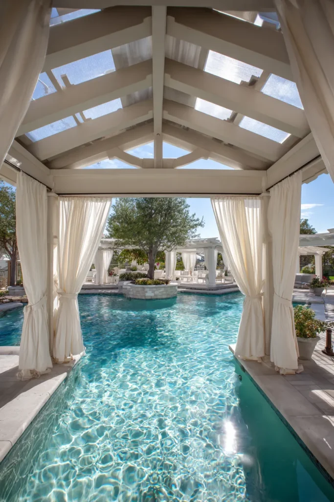 I honestly think this design is absolutely the dreamiest way to elevate a simple pool area—it just screams high-end vacation. I absolutely adore the all-white palette paired with those flowing cabana curtains because it feels so effortlessly glamorous and chic. The clever use of the clear panels in the roof is brilliant for getting that lovely natural light without being totally exposed to the sun. This is the perfect inspiration for turning your backyard into the most relaxing and beautiful retreat, proving that a pergola can provide both practical shade and seriously elegant style.
