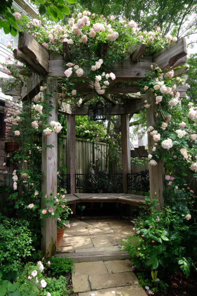 This absolutely enchanting pergola is straight out of a beautiful English cottage garden, acting as a secluded, incredibly romantic little hideaway. The rustic wooden structure is completely draped and overflowing with hundreds of gorgeous, pale pink climbing roses that frame the entrance and create a fragrant, flower-filled ceiling. Tucked beneath the blooming canopy is a charming wooden and wrought-iron bench, providing the perfect, quiet spot for reading or reflection. The whole scene is set on a quaint flagstone path, surrounded by lush green undergrowth, making it feel like a truly secret and magical corner of the yard.