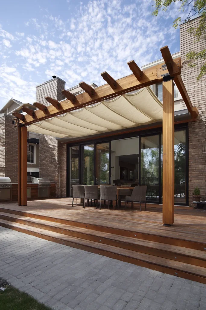 This clever pergola design perfectly combines function and style, providing flexible shade right off the back of a brick home. The structure itself is built from beautifully finished, warm-toned wood posts and beams, creating a lovely contrast against the brick and the expansive glass doors. The standout feature is the retractable fabric canopy, which can be easily slid open to enjoy full sun or pulled shut to provide welcome shade over the outdoor dining area. The pergola sits atop a gorgeous wooden deck, which steps down to a paved patio, creating defined zones for cooking, dining, and relaxing.