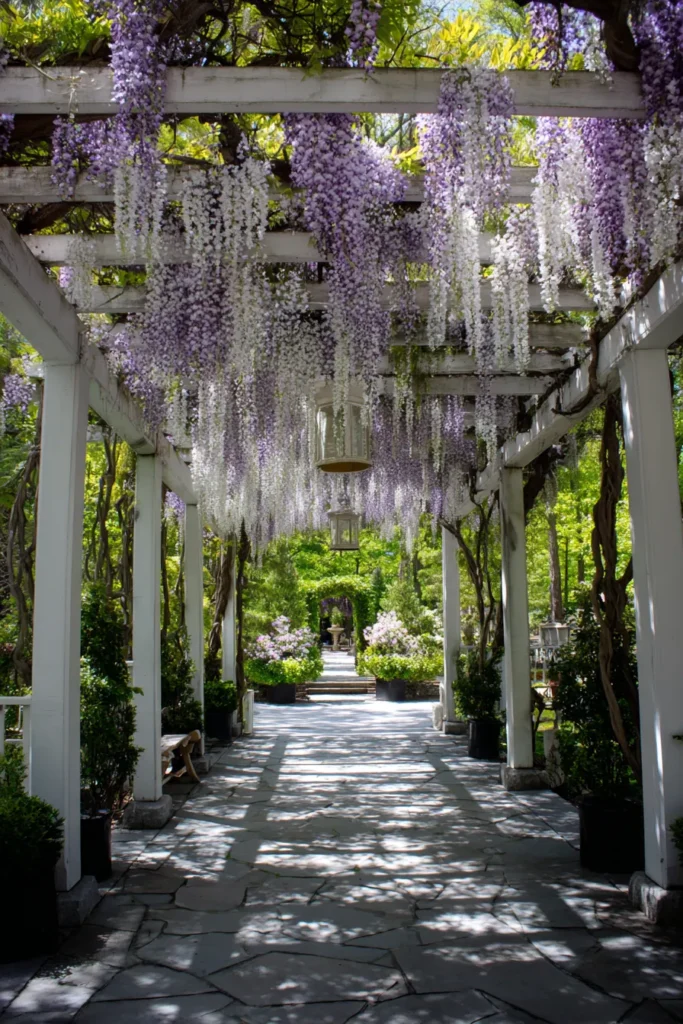 I honestly think this pergola is just pure magic—it’s the kind of breathtaking, show-stopping garden feature that truly belongs on the cover of a magazine. I absolutely adore the sheer drama and beauty of all that hanging wisteria; the way the purple and white blooms mix and tumble down is just so romantic and dreamy. It feels like you’re walking through a fairytale, and it proves that painting a simple wooden structure white is the perfect canvas for showcasing vibrant flowers. This is the ultimate inspiration if you want your pergola to be a central, truly unforgettable feature of your entire landscape.