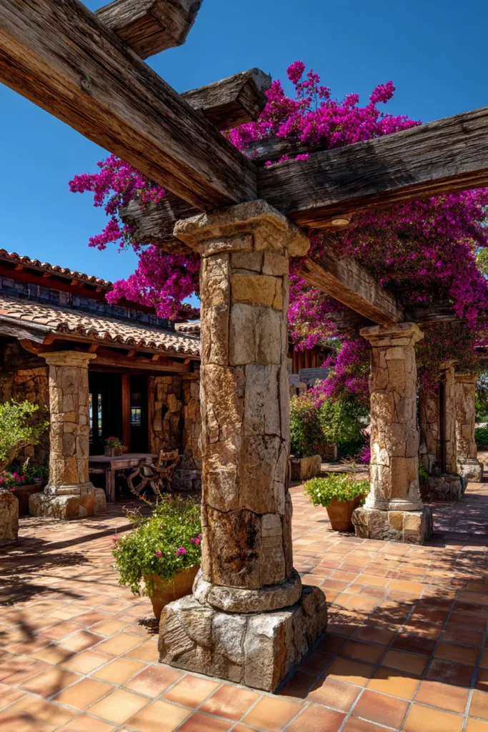 I am completely head-over-heels for the rich textures and colors in this design—it’s just so warm and utterly captivating. I absolutely love how those huge, rustic stone pillars contrast with the delicate, bright color of the bougainvillea; it’s such a powerful and beautiful pairing. This space feels incredibly grounded, luxurious, and so, so welcoming—imagine sipping a crisp glass of wine here in the late afternoon sun! It completely proves that using natural, high-quality materials like stone and rough wood, combined with a show-stopping climbing flower, can create a pergola that feels like a piece of enduring, romantic architecture.