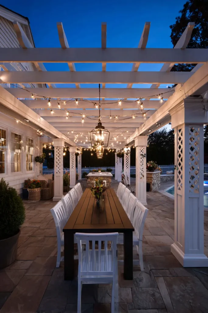 This beautiful pergola design creates a sophisticated, traditional outdoor dining room that feels like a natural extension of the classic white house it’s attached to. The structure is painted a crisp white, featuring lovely decorative lattice details on the columns that add a charming, cottage-style touch. A long, dark wood dining table is perfectly centered beneath the beams, flanked by matching white-painted dining chairs, providing seating for a large group. The atmosphere after dark is completely magical, thanks to an elegant central lantern and multiple strands of warm, festive string lights woven across the top, setting the perfect mood for evening entertaining.