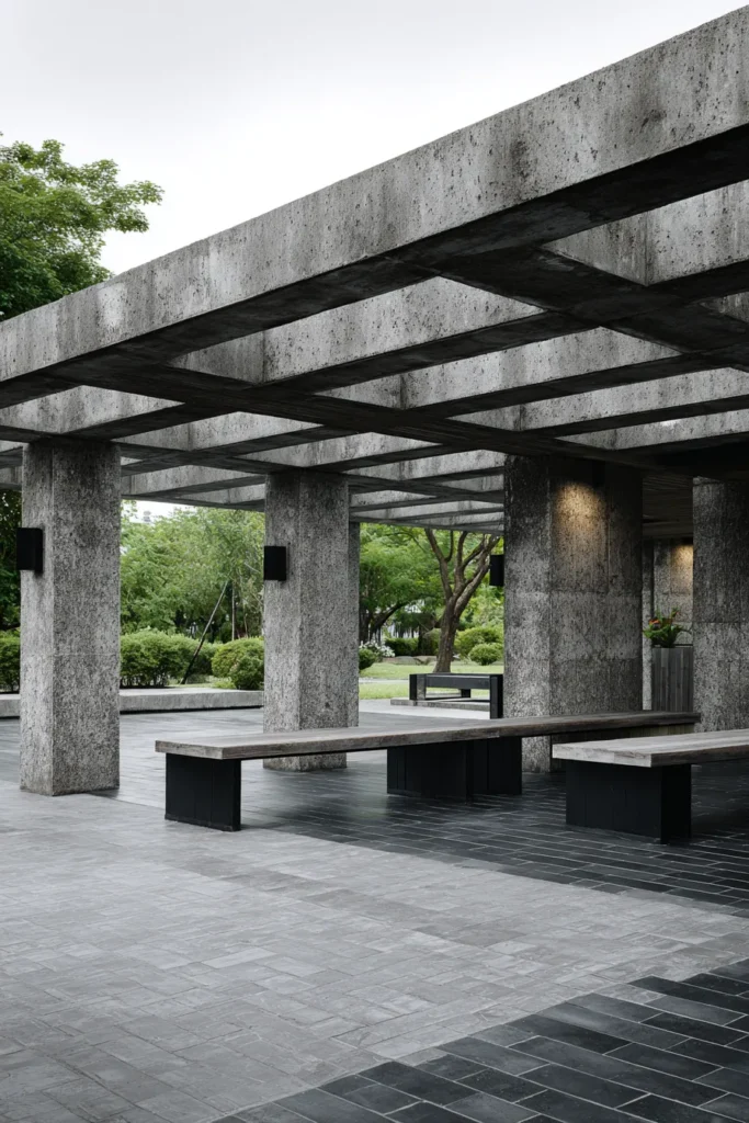 This striking design features a bold, brutalist-inspired pergola made entirely from textured, rough-hewn concrete that gives it a powerful, architectural presence. The massive, thick beams and columns create a strong grid pattern overhead, offering deep shadows and a commanding sense of shelter. Beneath the imposing structure, you can see sleek, minimalist benches with dark bases and light wooden tops, providing streamlined seating that contrasts beautifully with the raw texture of the concrete. The flooring is a cool, dark gray tile laid in a sophisticated pattern, emphasizing the highly modern and slightly industrial aesthetic of the whole space.