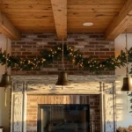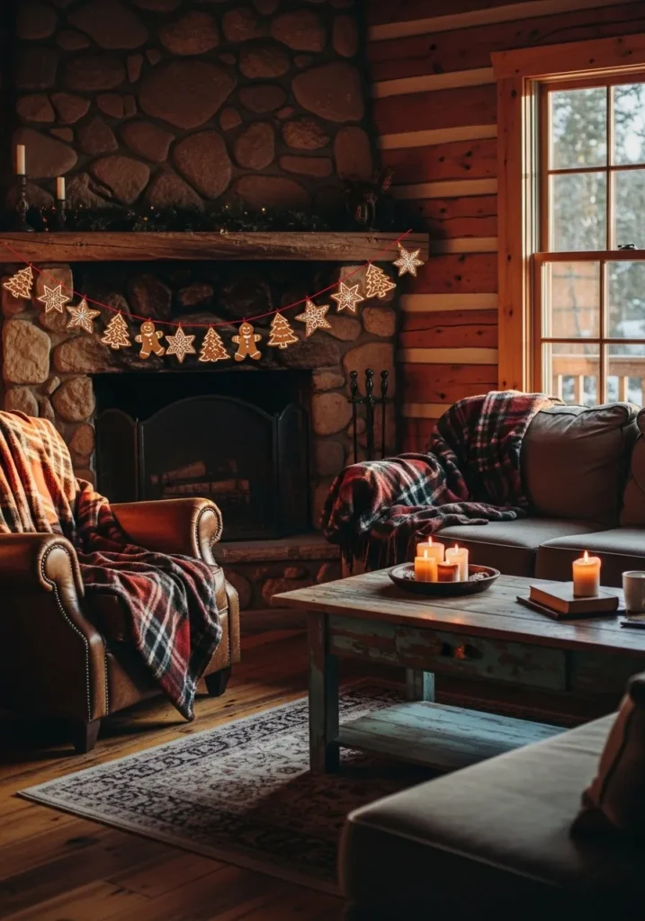 Nothing beats a rustic living room glowing with candlelight and gingerbread charm. The stone fireplace steals the show, dressed in a garland of cookie stars, trees, and gingerbread people. Soft plaid blankets drape over leather chairs, and the warm flicker from the candles makes everything feel like a comforting winter hug.