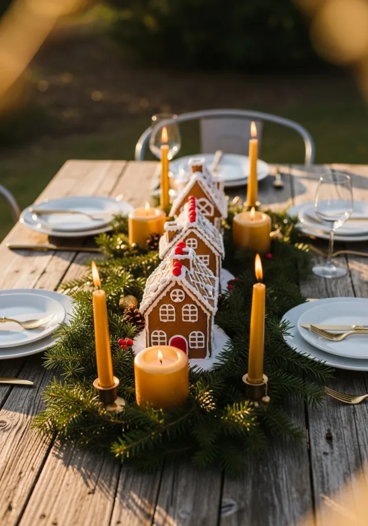 This outdoor table setup looks like it was plucked straight from a holiday dream. A row of tiny gingerbread houses stretches down the center, surrounded by fresh pine branches, golden candles, and a soft afternoon glow that makes everything shimmer. The rustic wooden table adds that perfect touch of countryside charm while the neatly set plates and glasses keep things elegant and inviting.