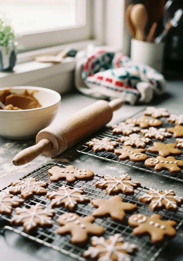 Flour-dusted countertops, cooling racks filled with snowflake and gingerbread-shaped cookies, and the comforting chaos of Christmas baking—it’s pure homey bliss. The soft light through the window makes the whole kitchen glow, and you can practically smell the spices in the air.