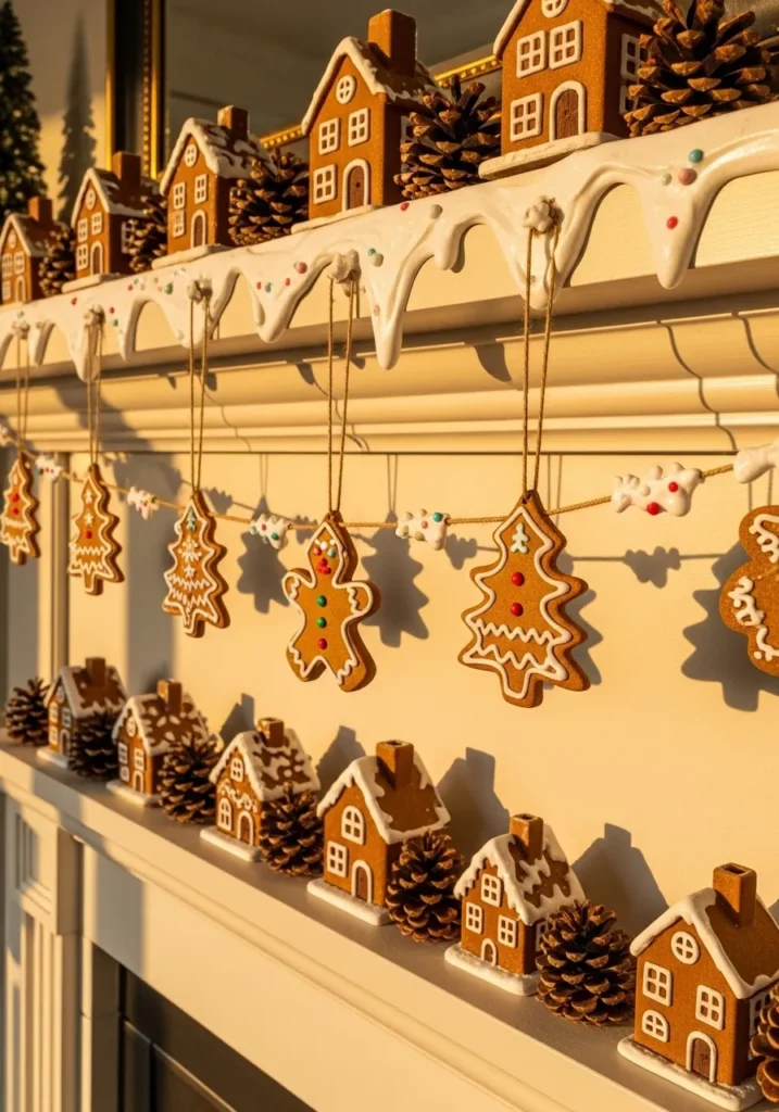 A row of tiny cookie houses lines the mantle, surrounded by pinecones and “icing” drips that look straight out of a frosted bakery. Hanging above, a garland of gingerbread shapes catches the golden light of sunset, giving the whole display a magical, glowing touch.