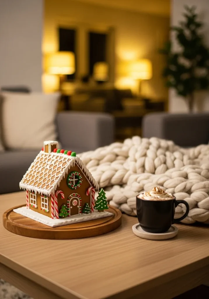 This living room scene feels like the definition of winter comfort. A single gingerbread house sits proudly on a wooden tray next to a steaming cup of cocoa, framed by soft blankets and golden evening light. The mix of warmth, texture, and sweetness is absolute perfection.