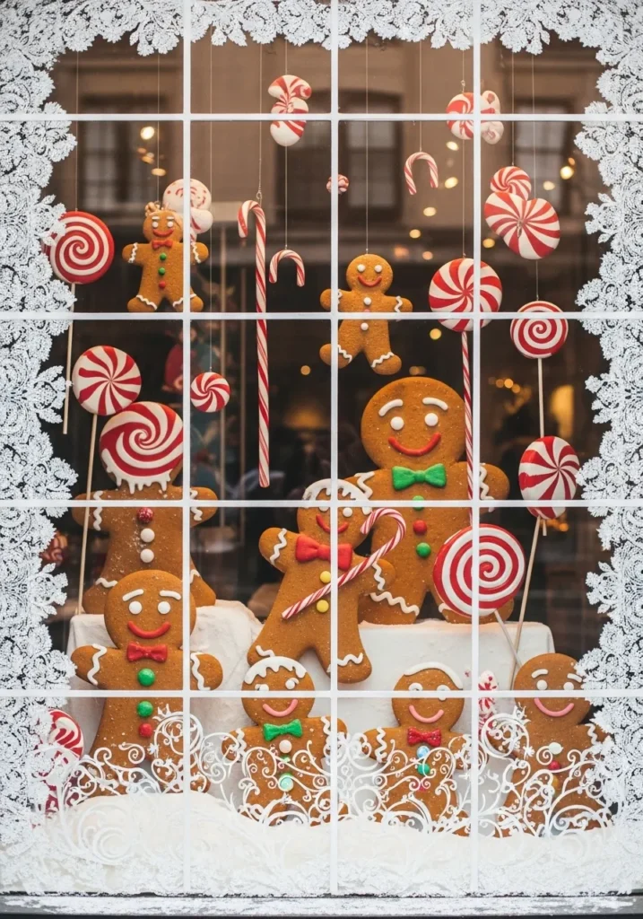 This window looks like it was borrowed from a storybook bakery. Giant gingerbread figures smile behind frosted glass, surrounded by candy canes and peppermint swirls. The lace-like window details frame everything beautifully, making it impossible not to stop and stare.