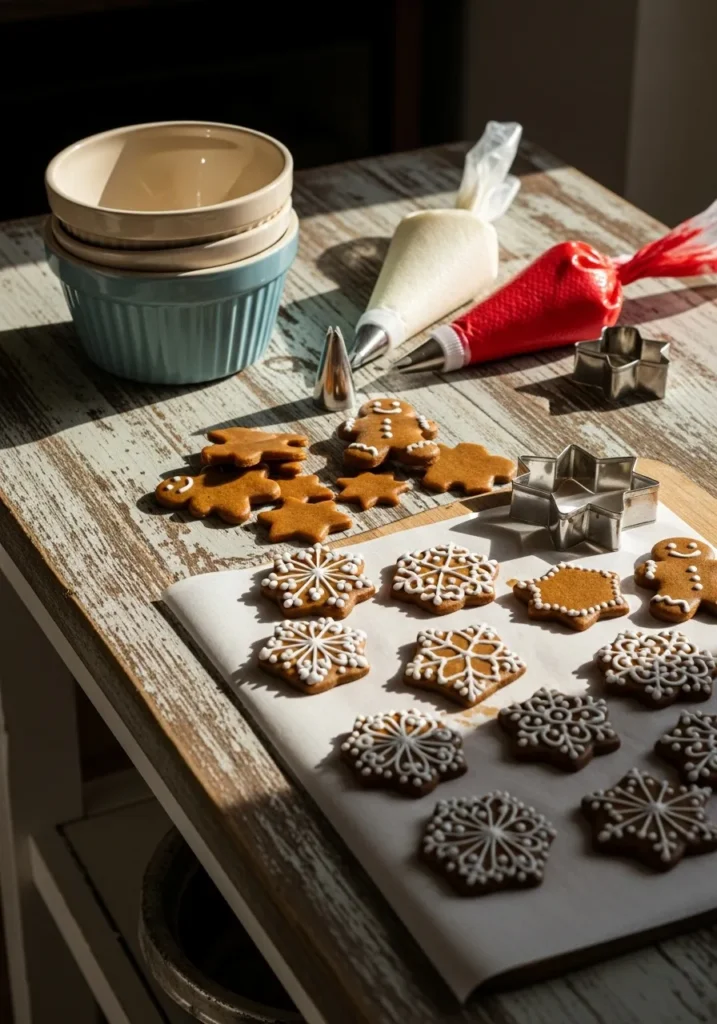 Stacks of bowls, piping bags filled with icing, and trays of freshly baked cookies waiting to be decorated—it’s the coziest kind of Christmas chaos. The sunlight catches the delicate white icing on the snowflake cookies, making them sparkle just a little bit more.