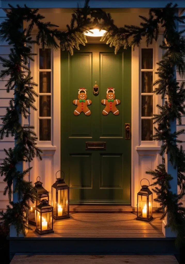 A pair of smiling gingerbread figures welcomes everyone at this green front door, surrounded by twinkling lanterns and evergreen garlands. The glow of the candles and the golden porch light make the whole entryway feel warm and magical.