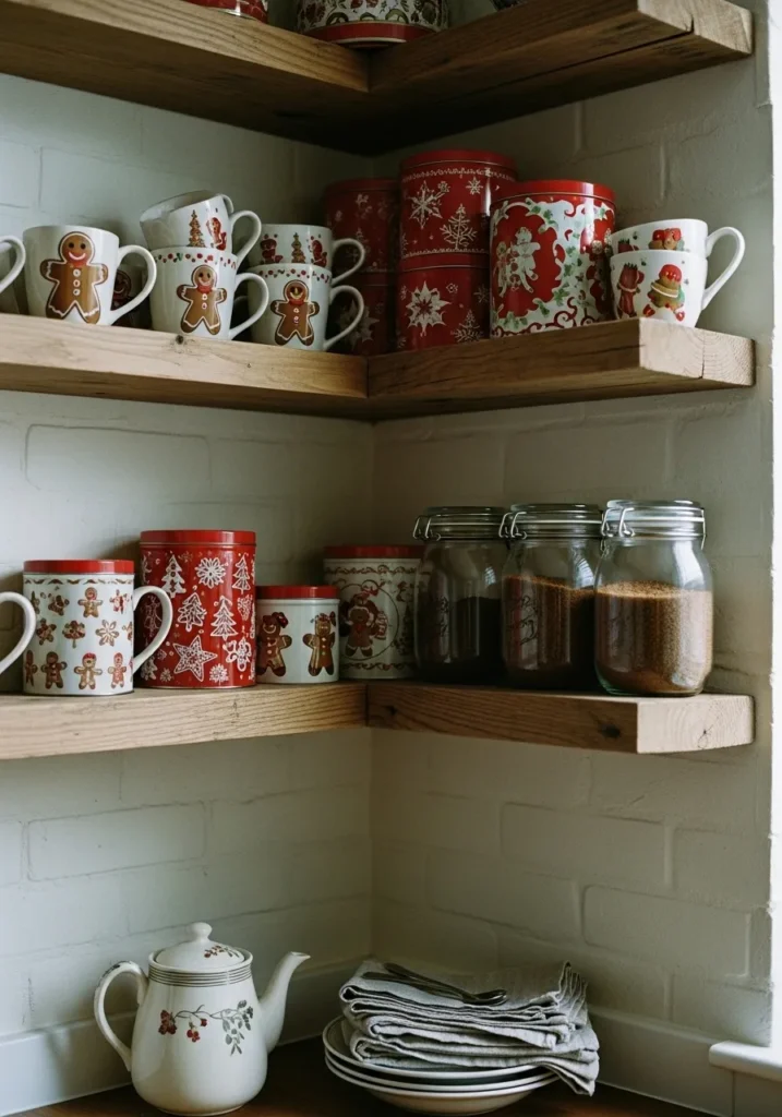 This little nook is a dream for anyone who loves their morning brew with a side of Christmas cheer. Shelves lined with mugs and tins covered in gingerbread prints make the space feel festive and fun. Add a few jars of sugar and coffee, and it’s basically a holiday café at home.