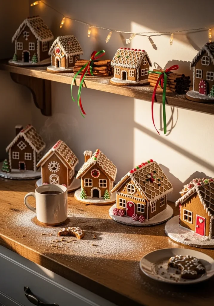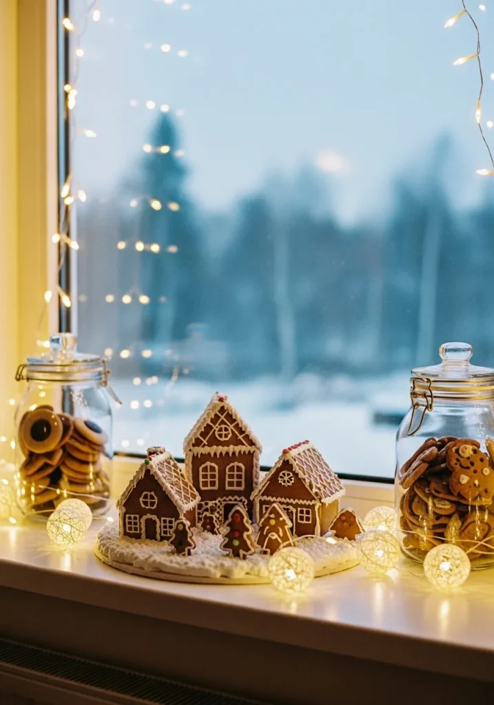 This cozy little scene turns an ordinary window into a gingerbread wonderland. Mini cookie houses rest on a blanket of sugar snow, surrounded by glowing string lights and jars of homemade treats. The snowy view outside adds to the magic, making it feel like the sweetest winter story come to life.