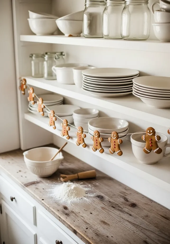 Nothing says homemade Christmas joy quite like a gingerbread garland hanging across open shelves. Here, little smiling cookie people string together above neatly stacked white dishes and cozy kitchen jars. A dusting of flour on the wooden counter hints that baking magic just happened, and I can almost smell the cinnamon in the air.