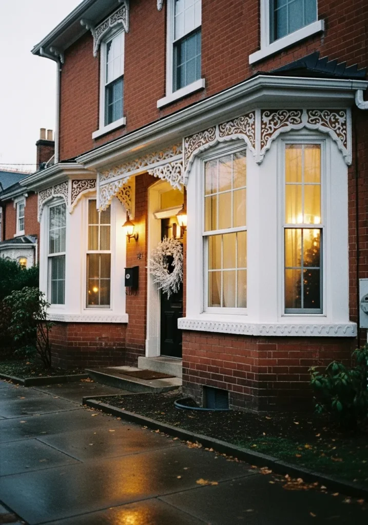 This charming brick home looks like a real-life gingerbread house with its intricate white trim and warm porch lighting. The frosted wreath on the black door and the glow from the windows make the entire scene feel straight out of a Christmas card. You can even spot the twinkling tree inside, adding just the right amount of festive sparkle.