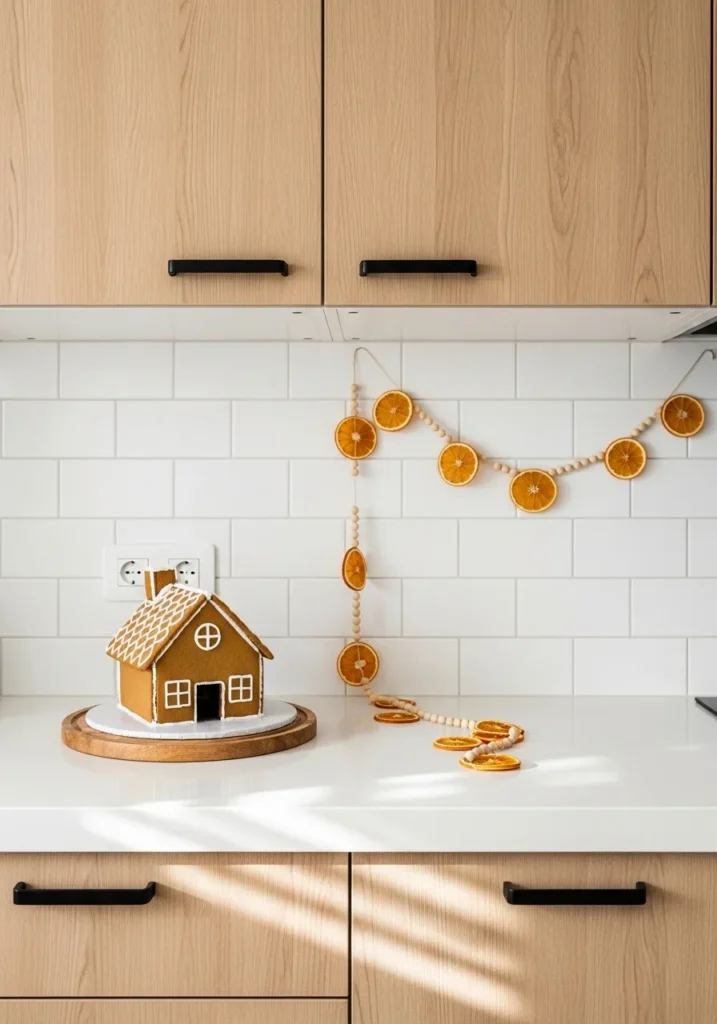 This modern kitchen keeps things sleek and simple with clean white tiles, light wood cabinets, and a single gingerbread house proudly displayed on a wooden stand. A garland of dried oranges and wooden beads brings warmth and color, tying the look together in a way that feels fresh and effortless.