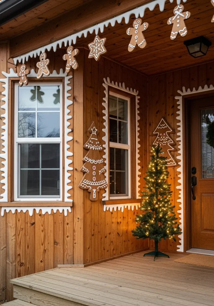 This wooden porch looks like it stepped straight out of a fairytale bakery. Oversized gingerbread men, stars, and trees frame the doorway, while white icing details around the windows add a playful touch. A small Christmas tree twinkles softly in the corner, completing the deliciously festive look.