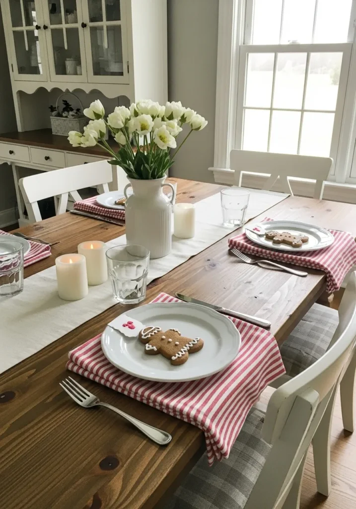 A wooden farmhouse table set with red-striped napkins, white plates, and a single gingerbread cookie at each seat—it’s understated perfection. The white tulips and candles add softness, while the cookies bring that touch of sweetness every Christmas table needs.