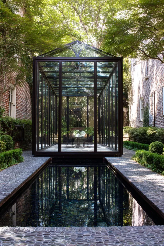 This design is pure magic bringing a classic conservatory feel right into the modern era. It’s essentially a stunning all-glass pavilion set beautifully in a walled garden space a true hidden oasis. The structure features a graceful gabled glass roof and a thin dark metal framework that maximizes the view of the surrounding lush greenery. Below the pavilion a dark reflecting pool mirrors the structure and the sky adding incredible depth and drama to the whole arrangement. The pathway leading up to it is charmingly paved with cobblestones giving it that old-world European garden vibe.