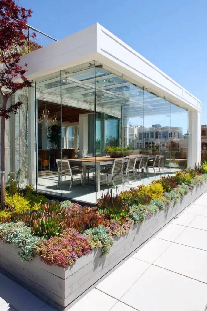 Look at this gorgeous space it’s the absolute epitome of urban luxury and smart design. This stunning structure is essentially a glass-walled solarium with a matching glass roof creating a protected dining room right on a rooftop. The crisp white frame and the huge transparent walls make it feel totally open to the sky and the surrounding city views. A beautiful concrete planter brimming with colorful succulents and drought-resistant plants frames the entire space bringing a vibrant splash of nature to the sleek, modern setting.