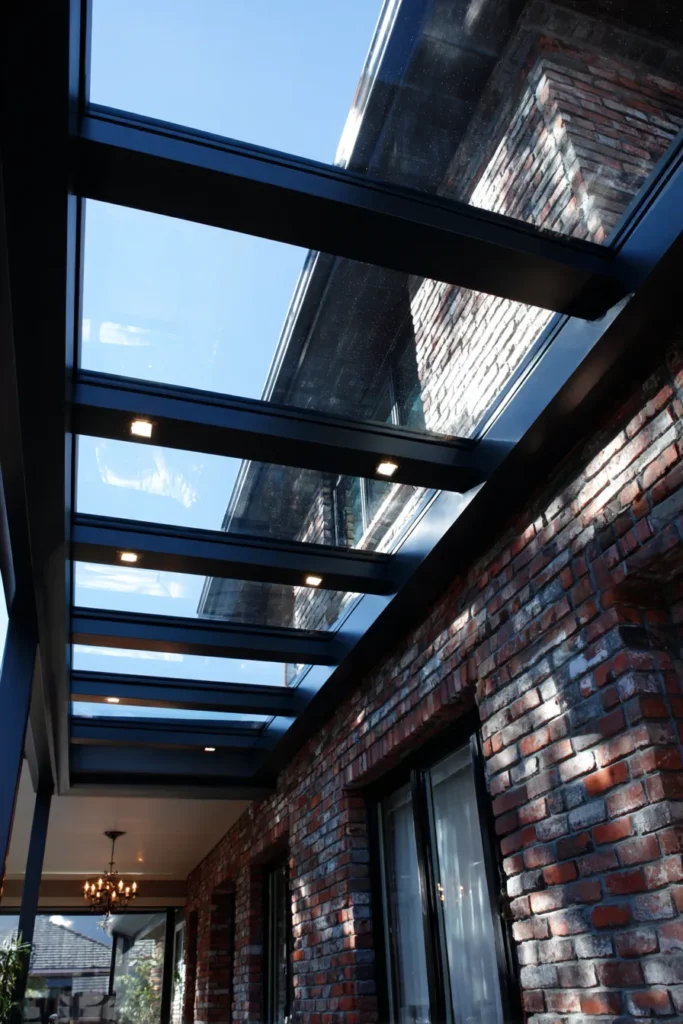 This design perfectly balances old-world texture with clean, modern lines which I just adore. It features a spectacular sleek glass roof canopy supported by a crisp, dark metal framework that runs parallel to the home’s exposed brick wall. This canopy dramatically transforms what would be a dark patio into a bright, protected space. The dark frame against the rustic red brick creates a beautiful contrast, and the clever placement of recessed lighting in the framework makes the space usable and atmospheric even at night.