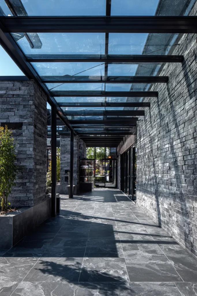This design is incredibly striking and dramatic creating a chic industrial feel with a touch of elegance. It features an extended glass roof canopy supported by a bold, dark metal frame creating a protected walkway or gallery space. The walls are constructed from beautiful dark grey stacked stone or brick which provides a fantastic texture and a moody contrast to the bright glass ceiling. The floor is covered in large, deep-toned slate tiles completing the sophisticated, cohesive look and highlighting the long lines of the structure.