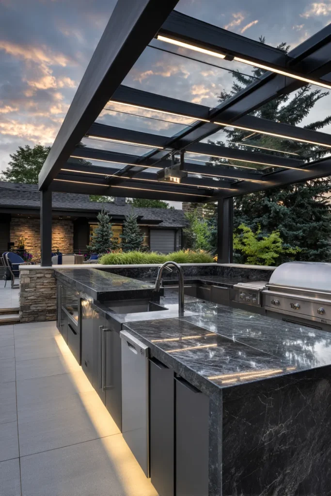 Get ready to feel some serious backyard envy because this outdoor kitchen is absolutely next-level. It features a spectacular dark-framed pergola with a glass roof that allows for protection while keeping the space open to the sky. What really elevates this design is the incredible integrated strip lighting built right into the pergola’s framework creating a stunning and functional glow perfect for evening entertaining. Below, the large island boasts gorgeous dark marble countertops and sleek, modern cabinetry making it the ultimate chef’s dream space complete with a built-in grill and sink.