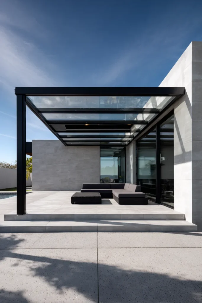 This design is the definition of chic simplicity and high-end minimalism. It features a stark black metal frame holding a crystal clear glass roof that extends over a protected outdoor lounge area. The contrast between the dark pergola and the smooth, light grey stucco or concrete walls and patio flooring is absolutely stunning creating a sophisticated monochrome palette. The entire setup is incredibly clean with modern, low-profile black seating that perfectly matches the frame ensuring the focus remains on the beautiful architecture and the open sky.