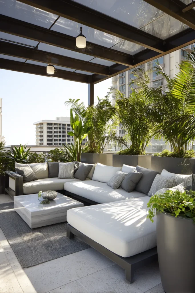 Wow this is the perfect example of creating a tropical oasis right in the middle of a concrete jungle. This stunning rooftop lounge features a spacious sectional sofa piled high with cozy pillows set around a sleek white marble coffee table. The entire area is covered by a modern pergola with a dark metal frame and a clear glass roof which allows for plenty of sunshine while providing protection from the elements. Best of all the space is beautifully framed by linear planters bursting with lush palms and tropical plants completely screening out the nearby buildings for a sense of privacy.