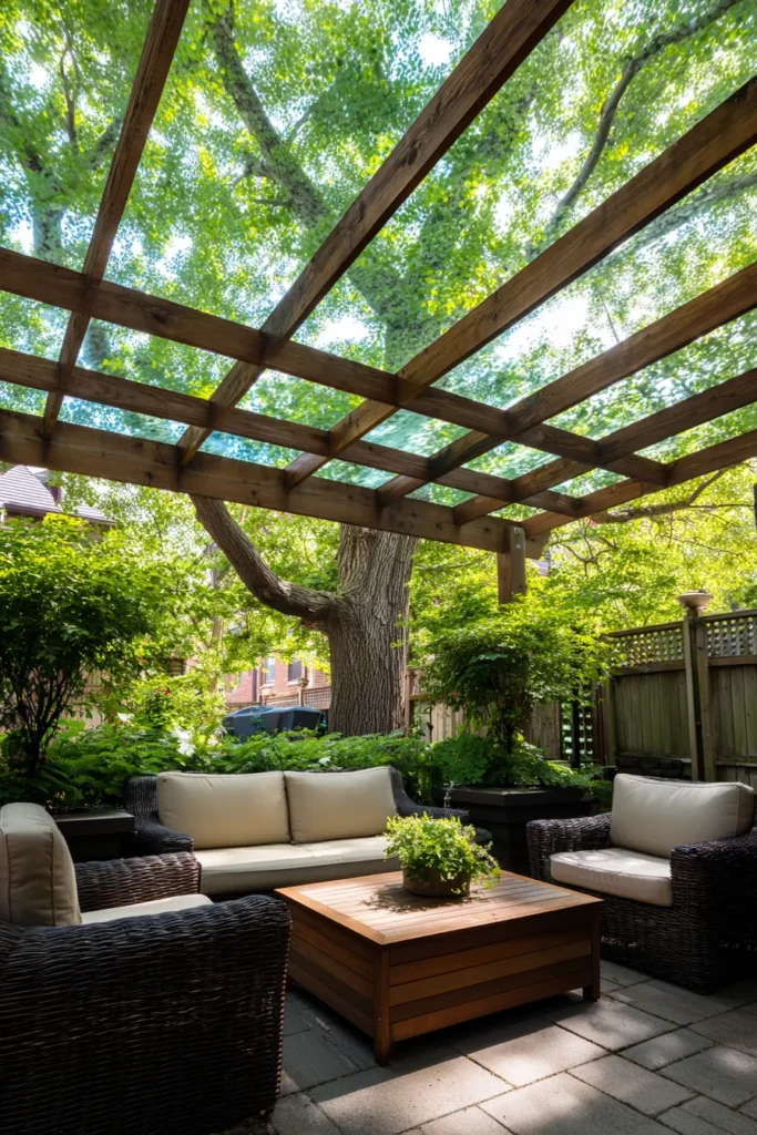 Oh my goodness this space is a dream for anyone who loves spending time nestled right in nature. This pergola features a warm timber frame beautifully contrasted by a clear glass roof cleverly installed over the classic wooden beams. The glass roof allows you to look right up into the huge, established tree canopy above which creates a lovely filtered, dappled light over the entire patio. Beneath, comfortable wicker furniture with plush cream cushions provides a cozy spot for lounging making the whole area feel like a private outdoor living room set in a lush backyard garden.