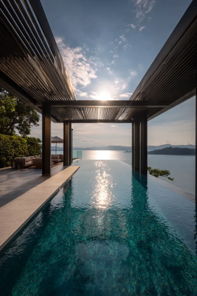 I am completely convinced that this is the most incredible view I’ve ever seen the way the sun glints on that water is simply magical. What I love most about this design is how dramatic and architectural the pergola is—it acts like a beautiful photo frame for that amazing ocean horizon. The slated roof is a smart touch because it gives you some needed shade for walking along the pool while still keeping the area bright and open. It’s truly a testament to minimalist elegance proving that sometimes all you need are clean lines and an unbelievable location to create a design that feels like pure fantasy.