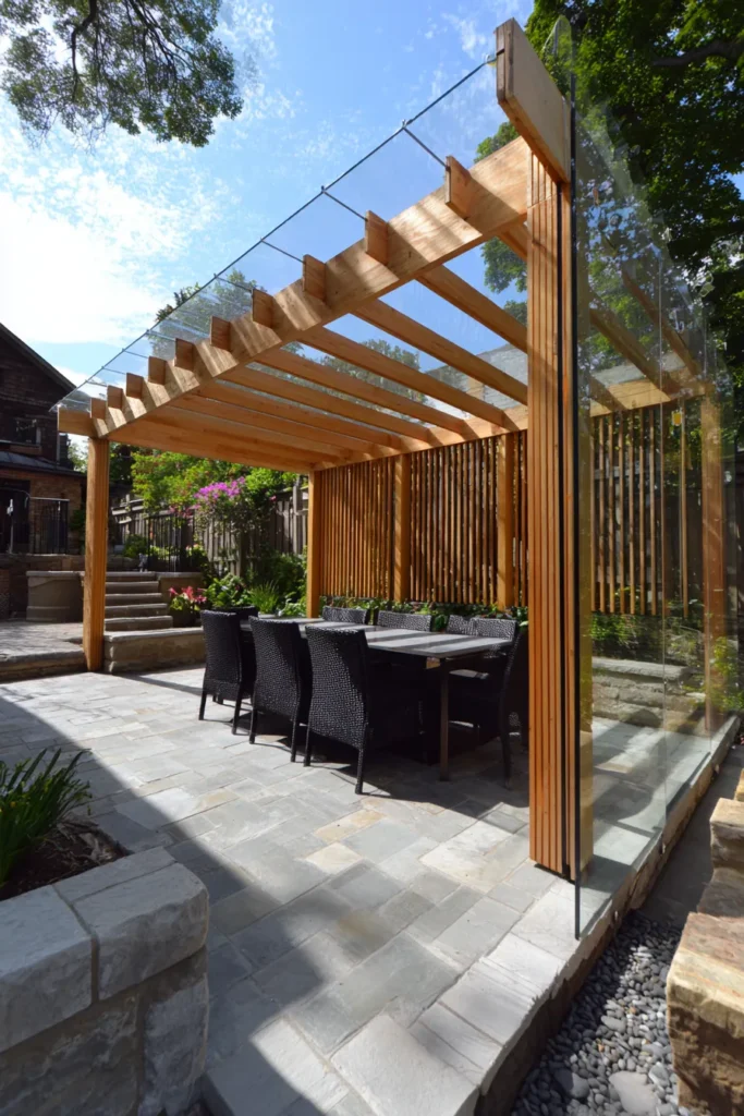 This design is a stunning example of creating an intimate outdoor room that still feels completely open to nature. It features a gorgeous warm cedar-toned wooden pergola with a clear glass roof supported by substantial wooden beams. The structure is partially enclosed by a full-height glass privacy panel on one side and a chic slatted wood screen on the adjacent side providing both protection from the wind and visual screening. This sheltered space houses a large outdoor dining table, perfect for big family gatherings, all set upon a beautiful stone patio.