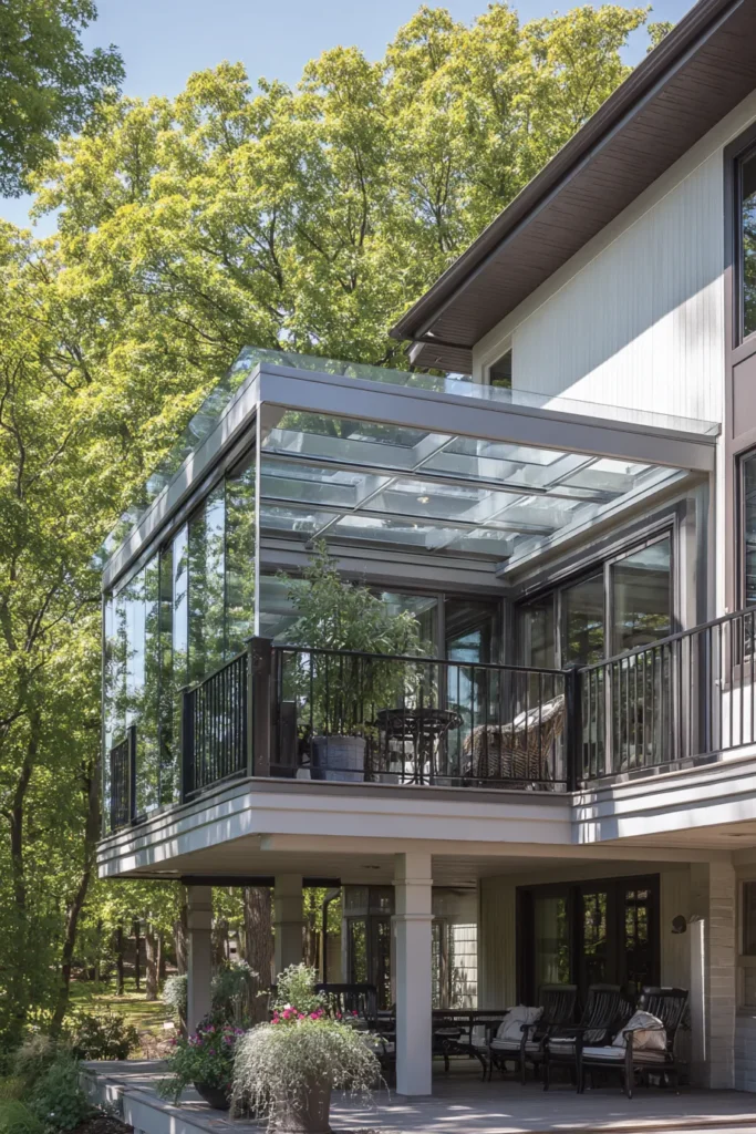 This design is the ultimate upgrade for any second-story deck or balcony giving you an amazing four-season living space. The structure features a sleek transparent glass roof and walls supported by a thin light-colored frame seamlessly blending into the home’s architecture. It extends outwards creating a bright sunroom-style pergola that still offers the open-air feeling of a deck with its glass railings. It’s truly an intelligent way to capture natural light and protect an outdoor seating area while overlooking a stunning wooded backyard.