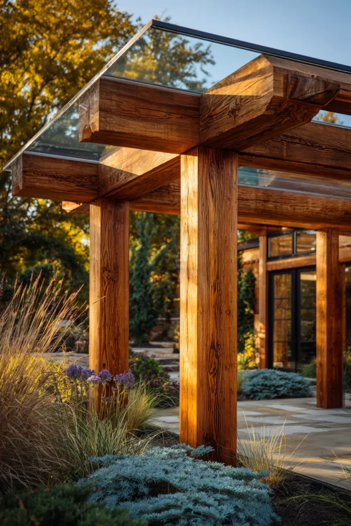 This design is a beautiful blend of rustic warmth and modern refinement. It features a substantial heavy timber pergola with gorgeous, richly stained wood posts and beams that give it a wonderful sense of permanence and strength. The roof is a sleek clear glass panel which contrasts beautifully with the rugged texture of the wood while allowing the natural light to flood the area beneath. The structure is set into a lovely naturalistic garden area surrounded by soft grasses and low-lying blue-grey plants creating a peaceful, grounded feel.