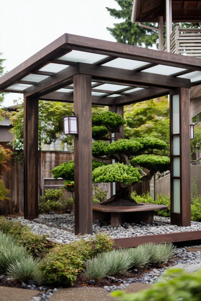 This is such a serene and meditative space offering a beautiful moment of calm in the garden. The design features a sturdy, dark-stained timber pergola built as a dedicated pavilion with a lovely partially frosted glass roof. The roof provides soft, diffused light, perfect for highlighting the spectacular centerpiece—a meticulously pruned bonsai-style tree seated on a low bench. The floor is covered in smooth grey river stones and bordered by low-lying, textured plants giving the whole area a wonderfully Japanese garden aesthetic. Lantern-style lighting on the posts adds a final touch of intimate charm.