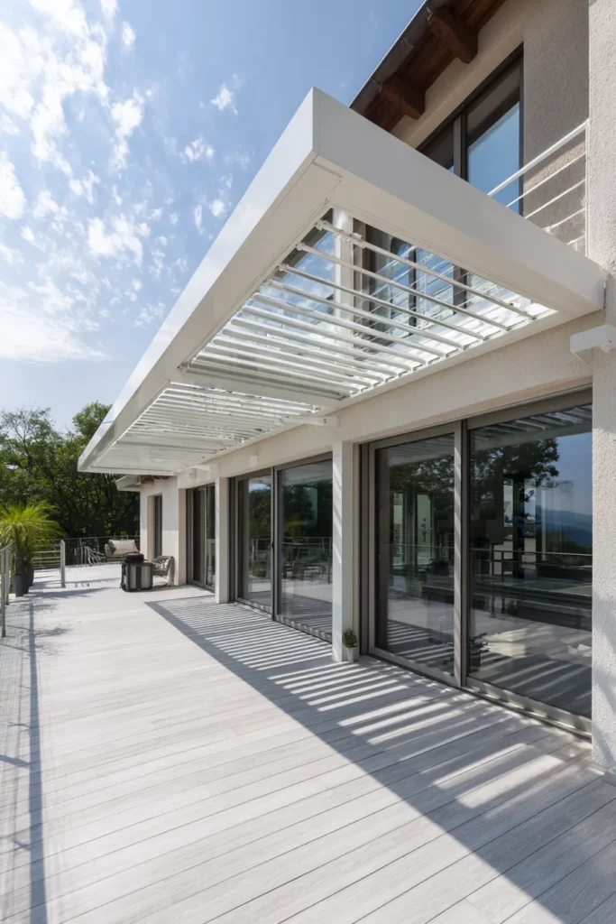 How absolutely fabulous is this outdoor space. It features a super modern and chic white pergola extending over a gorgeous light-colored wooden deck. What’s really cool about this design is the adjustable louvered roof which gives you total control over how much sun or shade you want at any given moment. It’s seamlessly integrated with the clean lines of the contemporary home which has expansive glass sliding doors that open right onto this fantastic deck. It’s all about creating a flexible and stylish outdoor living area perfect for entertaining or just chilling out.