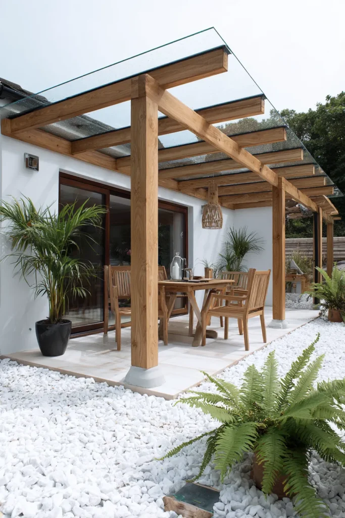 Talk about bringing a little bit of Bali vacation right to your backyard this design is absolutely dreamy. It features a gorgeous natural wood timber frame for the pergola giving it such a warm rustic-meets-modern feel. The roof is a sleek clear glass panel which provides perfect protection from the weather without blocking any of that lovely light. It shelters a simple yet stylish dining area set upon a patio surrounded by bright white decorative pebbles and lush potted tropical plants. The whole aesthetic is so calm and effortless a true sanctuary.