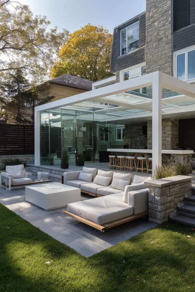Now this is how you do luxury outdoor living in a seriously chic way. This sprawling entertainment area features a brilliant white, modern pergola with a partial glass roof that beautifully shelters a sophisticated outdoor bar and kitchen area. The design cleverly incorporates both an open lounge area with plush white sectional seating and a more enclosed glass-walled space for a seamless transition. The use of natural stone cladding on the home and bar area ties it all together making it feel perfectly integrated into the high-end landscape design.