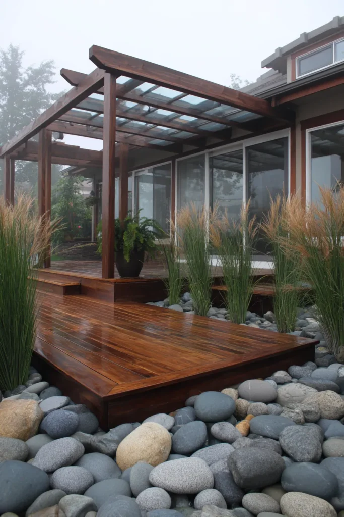 This design is an absolute dream for anyone who loves a natural Zen aesthetic. It features a stunning dark-stained wooden deck that seems to float above a bed of smooth, grey river stones creating a beautiful contrast. The deck is partially sheltered by a matching timber pergola topped with clear glass panels that allow the light to pour through while keeping the rain away. Lush ornamental grasses and large boulders frame the space adding texture and a wonderfully organic feel right next to the home’s expansive glass doors.