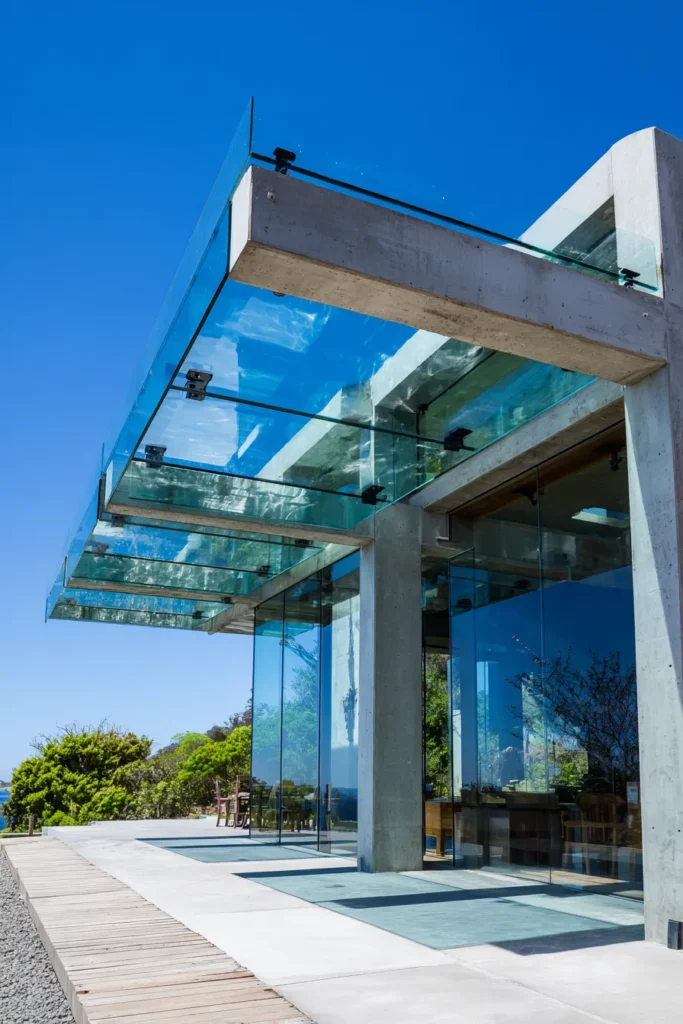 This design is a masterpiece of minimalist architecture truly breathtaking. It features a stunning cantilevered glass roof that seems to float effortlessly extending out from massive raw concrete supports. There are virtually no visible frames allowing the glass roof and the floor-to-ceiling glass walls below to create an almost invisible structure. This creates a spectacular sense of openness blurring the boundaries between the interior and the bright blue sky and lush coastal landscape outside. The whole look is one of uncompromising modern elegance and structural boldness.