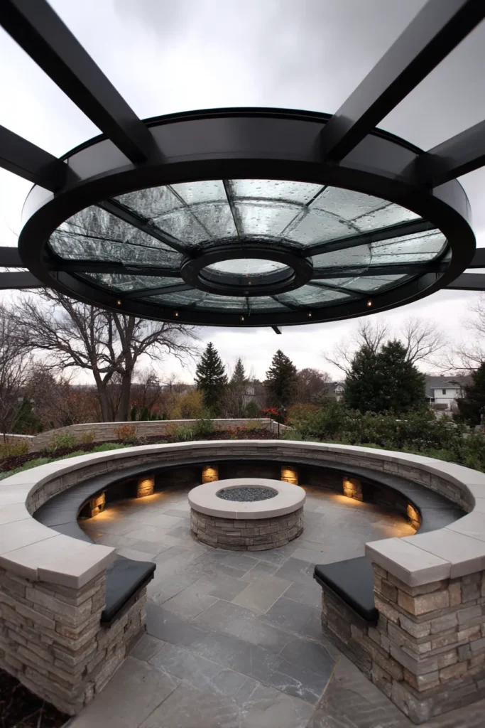 This is such a clever and beautifully executed design for a dedicated gathering spot. It features a spectacular circular glass roof supported by a dark, contemporary pergola frame directly centered over a cozy stone fire pit. The seating area is a gorgeous curved stone bench with built-in cushions and subtle accent lighting creating a wonderfully intimate and protected outdoor room. The entire space is paved with elegant slate or similar stone making it feel incredibly grounded and sophisticated even on a moody day.